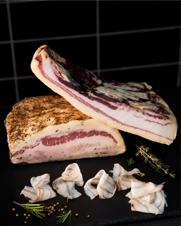Für feine Vorspeisen, Antipasti und authentische Pasta bieten wir zwei italienisch inspirierte Schinken: Unser „Wedemarker Lardo“ vom Duroc-Schwein reift mit Rosmarin, Meersalz, Knoblauch und Thymian für ein halbes Jahr. Hauchdünn geschnitten zergeht er auf der Zunge. Unser Guanciale hebt Ihre Carbonara auf die nächste Stufe. Abgeschmeckt mit italienischen Kräutern wie Oregano und Gewürzen wie Anis reift auch er sechs Monate.