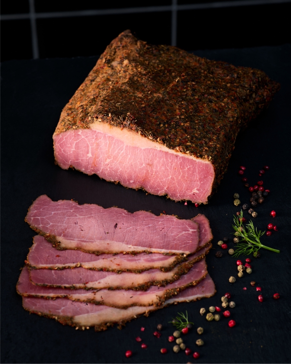Ob als Sandwich-Klassiker oder Signature-Topping: Unser Pastrami wird mit viel Liebe aus gepökelter Rinderbrust und sorgfältig ausgewählten Gewürzen hergestellt. Nach dem Beizen mit verschiedenen Pfeffersorten, Ingwer, Kumin und Koriander wird es mit einem Rub schonend gebacken und gegart. Das Ergebnis: intensive Würze, saftiger Biss und ein klarer Handwerkscharakter.